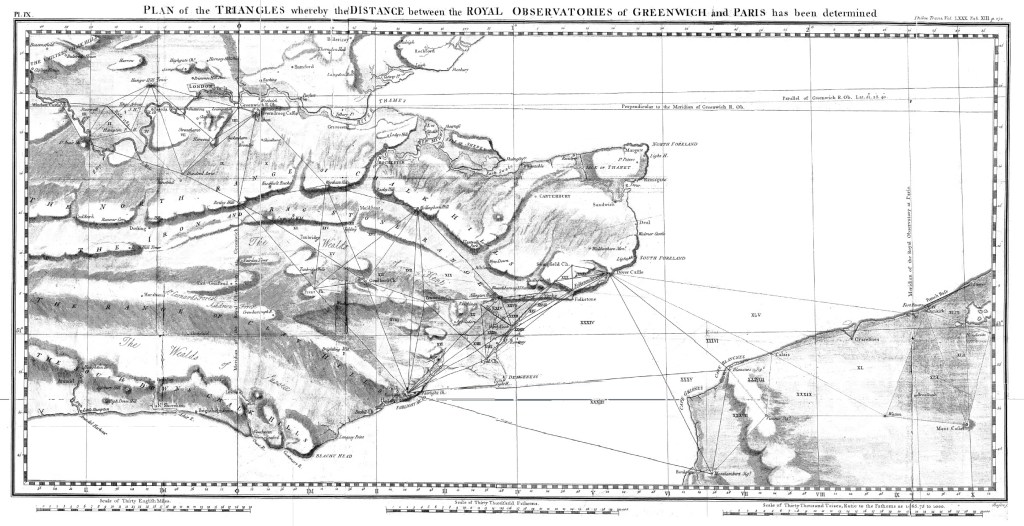 By the 1780s, the Cassinis had built a vast triangulation network across continental Europe, linking France to Holland and extending eastwards towards Vienna. In 1783, Cassini de Thury, Director of the Paris Observatory, wrote a memoir to the British government arguing that, “for the progress of astronomy“, it was essential to establish “la différence”, or the precise positional relationship between the Paris and Greenwich observatories. He suggested, pointedly, that Greenwich itself might be misplaced by several seconds. Astronomers, following the Cassini tradition, had determined the difference in longitude between the Royal Observatory, Greenwich and the Paris Observatory by observing eclipses and the satellites of Jupiter. The accepted value was approximately 9 minutes 30 seconds of time. [1]