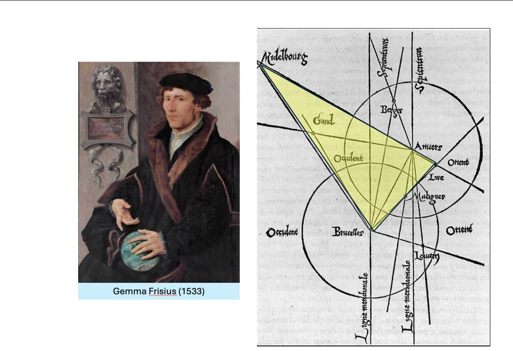 Gemma Frisius, Mercator’s teacher at the University of Leuven in modern-day Belgium, described the concept of triangulation in 1533. It was, he said, a method “very useful and profitable for all geographers, teaching how to measure and compute the distance between two places which was never seen.” The principle was simple: if you measure one side and all the angles of a triangle, you can calculate the lengths of all the other sides using trigonometry. By extending a series of interlocking triangles across long distances over the land, the unknown distance between two points could be measured.