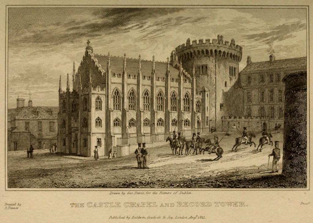 Header Image: Dublin Castle Chapel and Record Tower, 1821 — steel engraving after a drawing by George Petrie, presenting the early 19th-century architectural profile of the Chapel Royal alongside the medieval Record Tower in Dublin Castle’s historic complex. Source Library of Congress