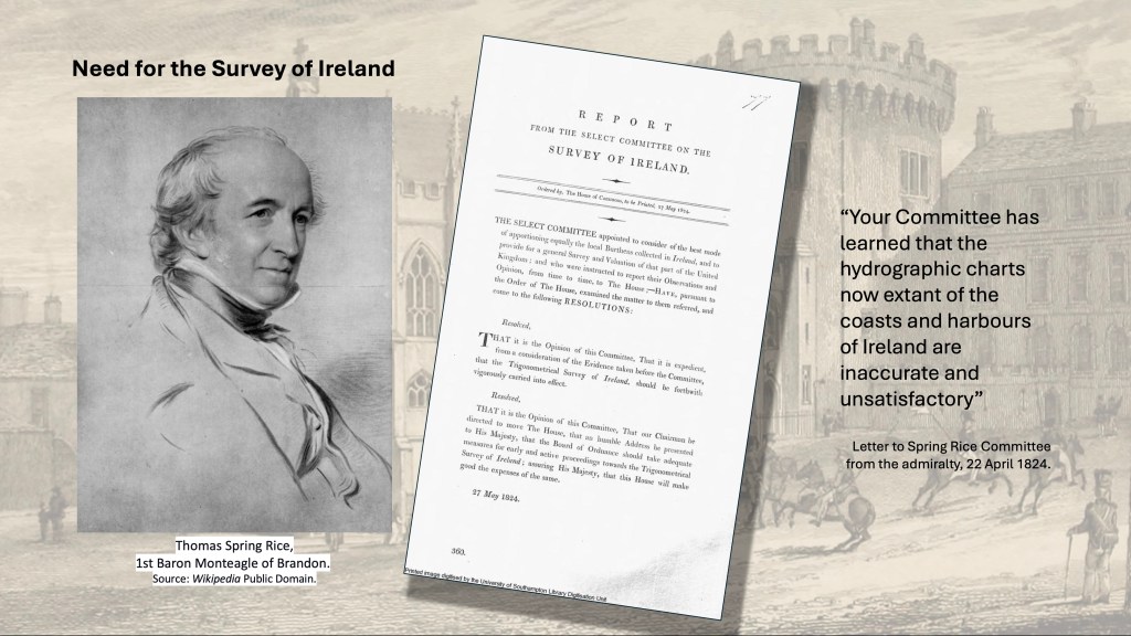 Thomas Colby had petitioned Wellington for the job of Superintendent of the Trigonometrical Survey in Great Britain following the retirement of William Mudge and was appointed in 1820. Colby wrote to the Board of Ordnance in February 1824, proposing that the Board undertake a Survey in Ireland required to support land-based tax reform. This was probably at Wellington’s request, following a series of conversations Wellington had with the Chief Secretary of Ireland about increasing unrest there and the need for land reform. [3] In addition, the Admiralty had called for the Board of Ordnance to provide the trigonometrical framework for a new hydrographic survey following the Napoleonic wars, repeating their request in 1819 during a Parliamentary debate and again in 1822 after one of their ships had been wrecked on uncharted sandbanks. [4]