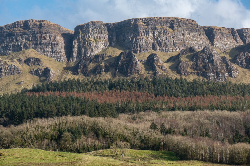 Volcanoes formed the mountain, the basaltic cliffs its signature. Lough Foyle once lapped against these cliffs, and below them, a stony ridge is all that is left of that ancient shoreline. The sea eroded with one hand and gave with the other. Inishowen was once so close that it was said a lamb could skip from Magilligan to Greencastle. Now they are two miles distant. A fairy living near the mouth of the Foyle on the Ton Banks had cursed the parish after her carpet was stolen. She declared that every year the breadth of the carpet would be swept away from the shore.