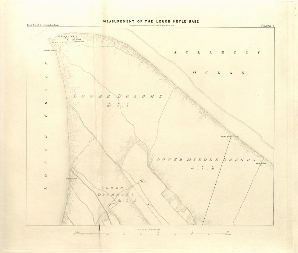 When the surveyors arrived to measure the Lough Foyle baseline in the late 1820s, it wasn’t an empty landscape. Yes, it was wild, and if they had taken a ride around the coast, they would have found the wind and light working off each other, on one side the ocean wild with foam and glitter, and on the other, grass swaying amongst the dunes. [i] They found a land shaped by fire, water, ice and wind, and by centuries of settlement, farming, and folklore. Their six-inch maps captured the townlands with precision, and their Memoirs recorded the lives of the people who lived there. Together, they offer a glimpse of Magilligan and Myroe just before the upheavals of the nineteenth century.