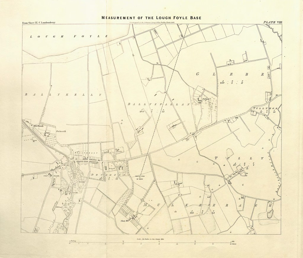 Place names reveal the deep history of the area. Duncrun means “fort of the Cruithin”, the Ancient Irish Cruithnigh, a people that existed in the area before St. Patrick. Myroe (Moyroe) came from the Irish Maigh Ró, meaning “plain of the Roe”, the low ground between Limavady and the River Roe probably reclaimed from Lough Foyle in earlier centuries. It is across this plain, and Magilligan north of the Roe, that the baseline was measured. Nearby stands the church of St Aidan at Tamlaghtard, a site with layers of history, from pre-Christian ritual, early medieval foundations and later church buildings. Local tradition associates it with St Aidan of Lindisfarne (d. 651), though historians remain uncertain about that connection.